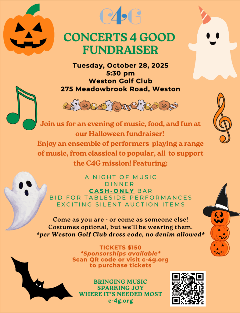 Please join us for an evening of Halloween fun and fundraising, music and food to benefit Concerts 4 Good, at the Weston Golf Club (275 Meadowbrook Road, Weston). There will be an ensemble of talented performers in costume (including St. Julia’s Brian Moll and Mara Bonde) playing a range of music, from classical to popular, all for a good cause. In addition to live musical performances, the evening includes dinner, cash bar, song auctions and more. Come in your favorite Halloween costume, if you wish!